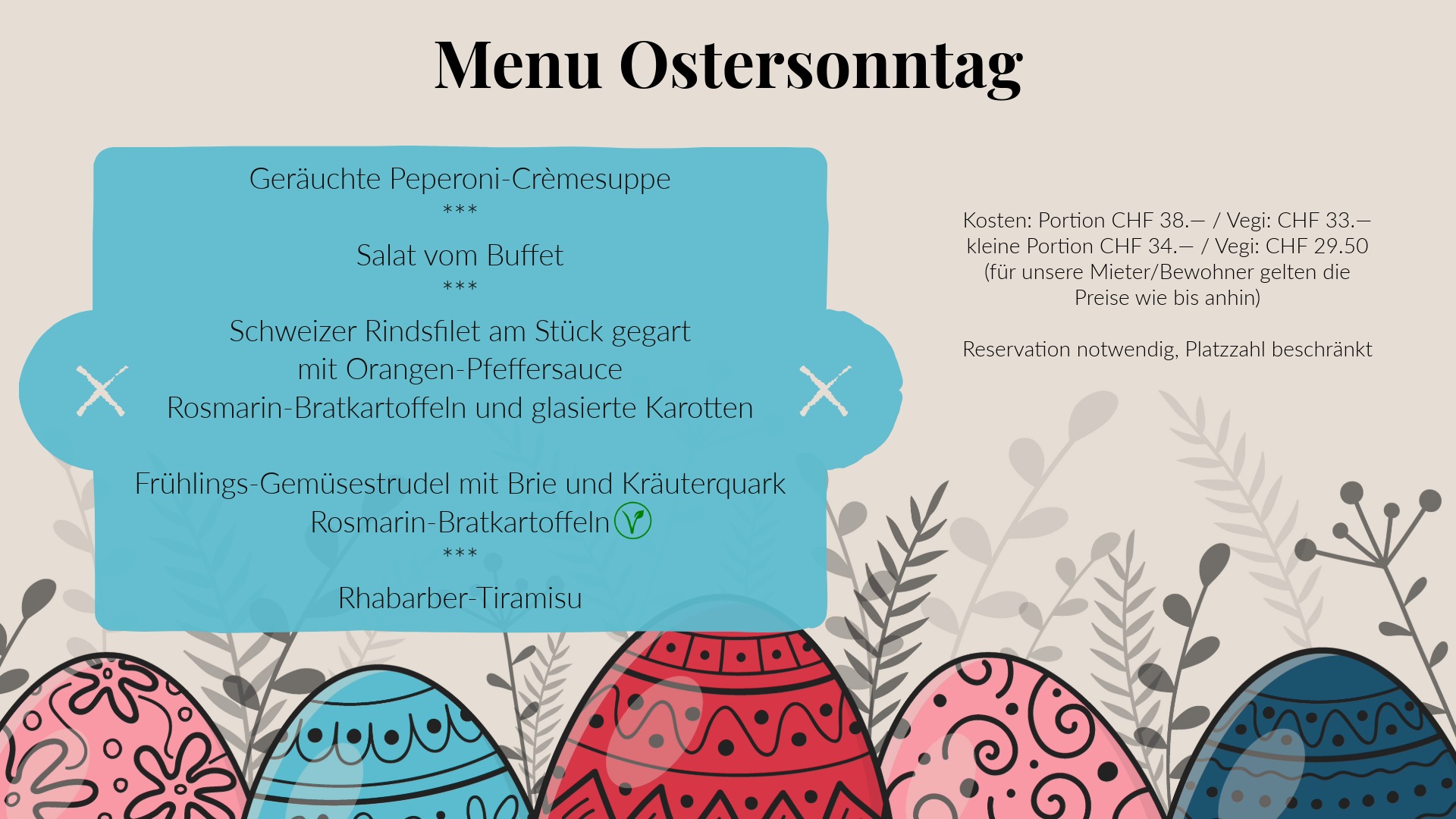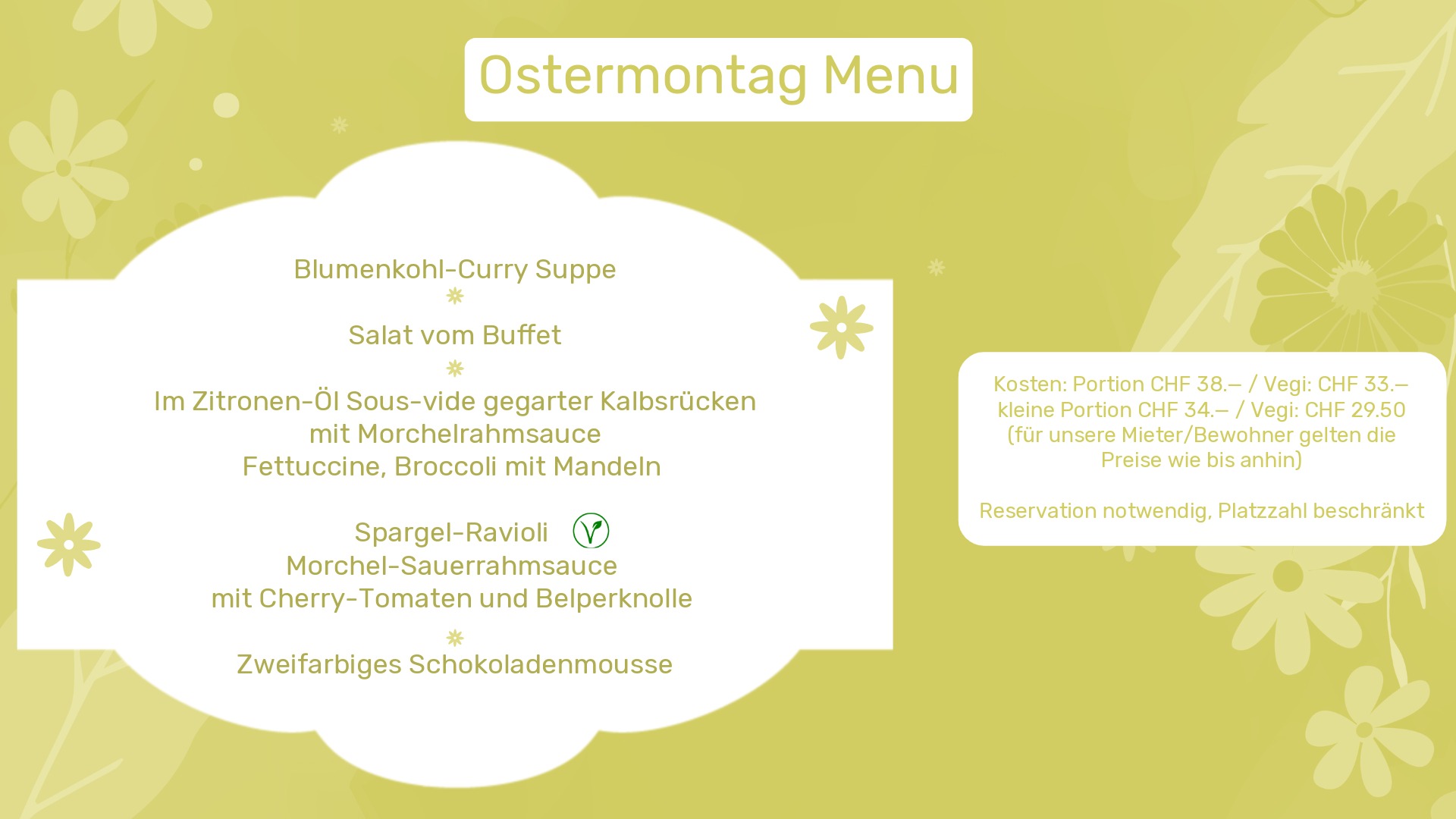 CHF 52.– / Vegi CHF 48.– (exkl. Getränke)