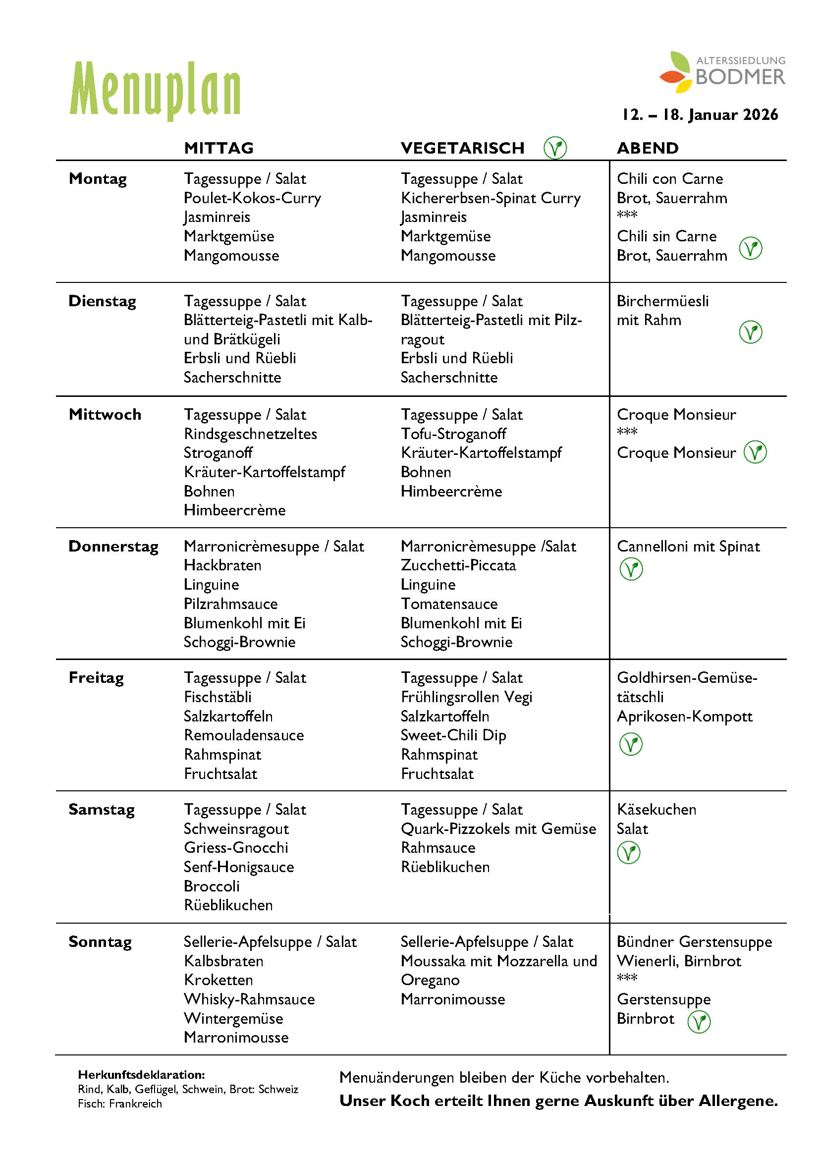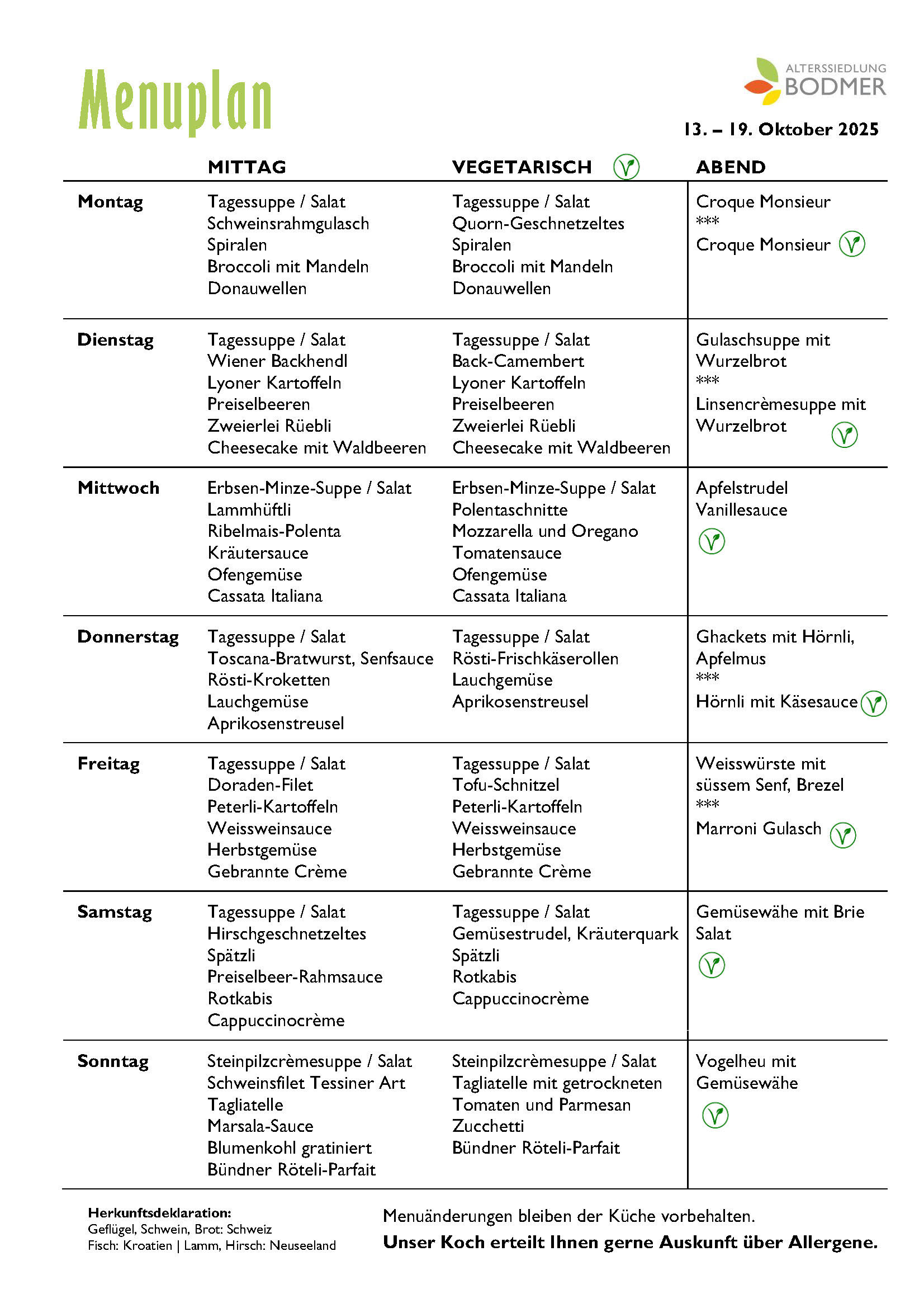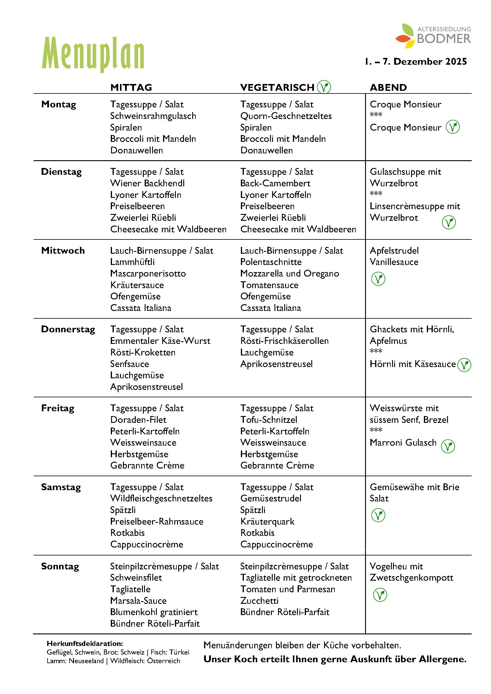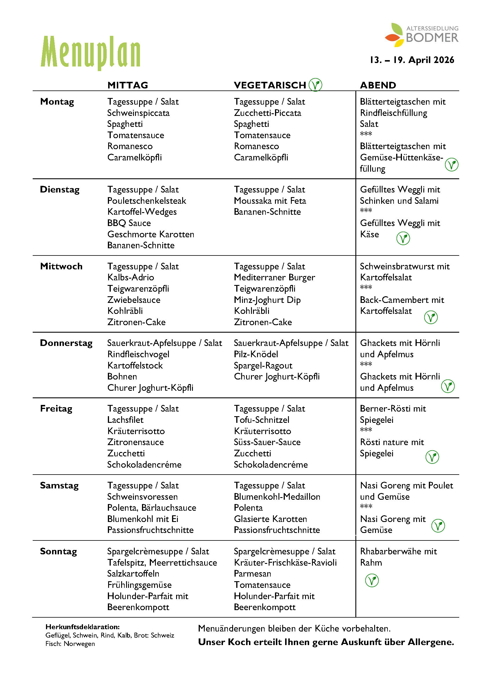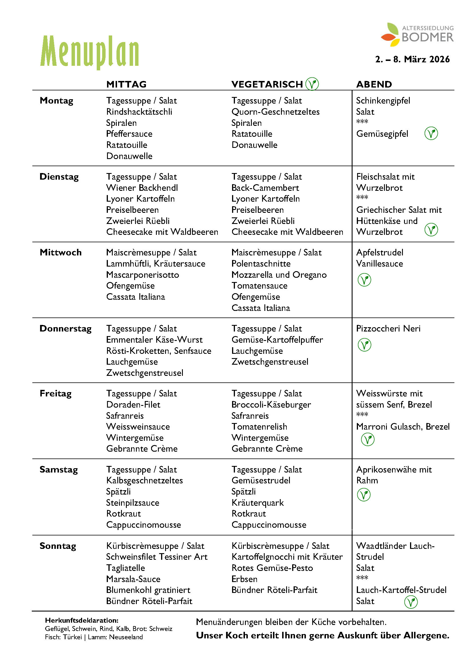 Die Alterssiedlung Bodmer ist ein Ort der Begegnung. Im öffentlichen Café bieten wir eine vielfältige und ausgewogene Menükarte mit täglich wechselndem Mittagsmenü und Wochenhit.